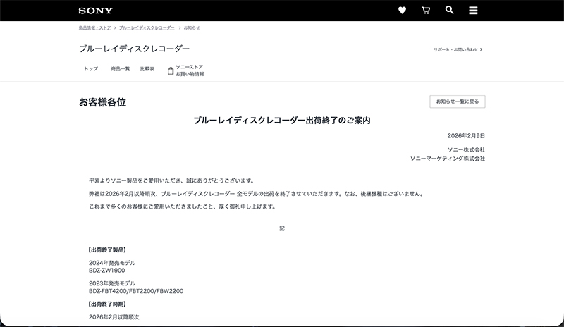2026年2月9日,索尼在其官方网站宣布将逐步停止所有蓝光录像机的出货,并明确表示将不再推出后续机型。