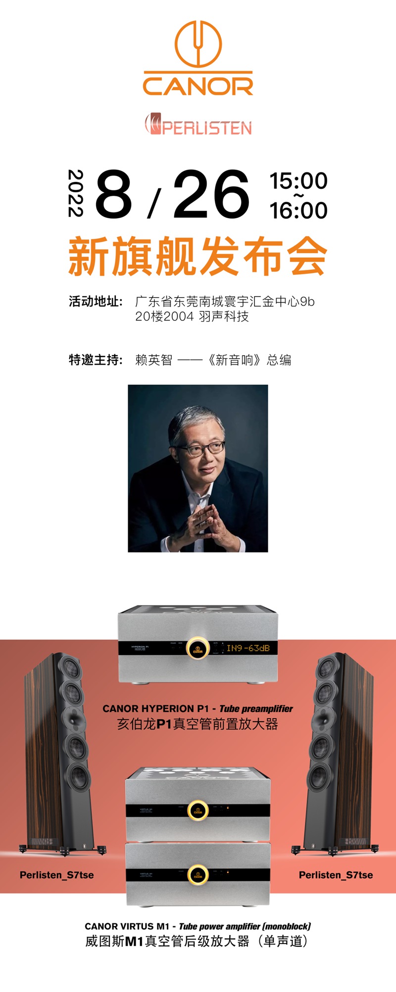 2022年8月26日下午 15:00~16:00 ,上海艾音仕携手东莞羽声于广东省东莞南城寰宇汇金中心9b-20楼2004 羽声科技举办「双剑合璧、黄金组合——Canor与Perlisten」:卡诺CANOR新旗舰前后级发布会,特邀《新音响》杂志总编赖英智先生主持。发布CANOR Hyperion P1真空管前置放大器以及Virtus M1单声道真空管后级放大器。并同步线上直播,敬请留意!