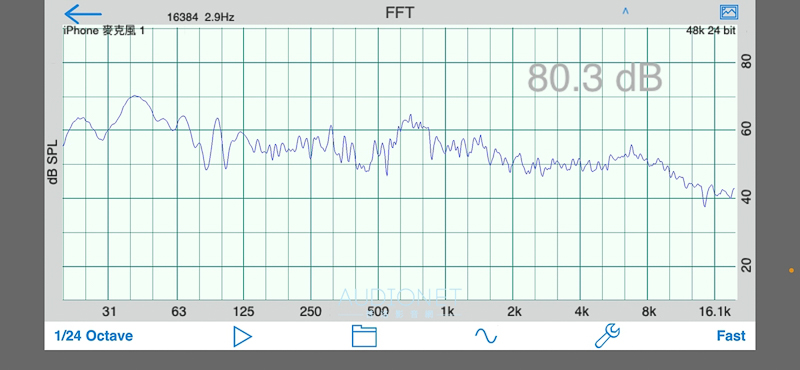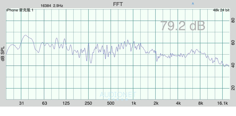▲尚未移动音箱时的频谱,请注意看31Hz-63Hz处有10dB低频峰值。 |
