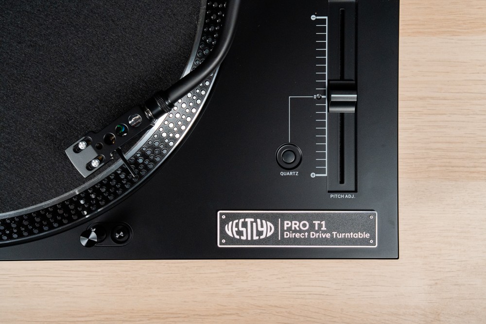 Vestlyd Pro T1 也配备了标准 DJ 盘的基础架构,让人一眼望去就知道它的属性。铝合金制转盘,周围还有转速检视用的标记。只要启动盘面上的转速监测用的 strobe light,就能检视当前的转盘转速。只要一启动唱盘,测速灯就会亮,只要观察转盘上的转速标记,就能确认当前转速稳定与否。要是有稍微偏差,透过 pitch 调整就可完成转速校正。这也是玩 DJ 盘最方便的地方。不过,我的经验是,Pro T1 转速稳定,我无须调整。这时,我可以按下唱盘右下角的 Quartz 键,这样就能锁定转速,也会直接 bypass 掉 pitch 调整,让你可以安心听音乐,不怕误触。