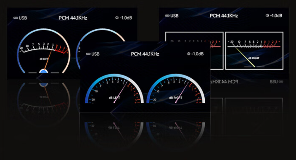 正面4.3英寸LED彩屏也是DAC-K9的一大亮点。屏幕不仅能实时显示采样率、编码格式等关键信息,更提供动态VU表模式——指针摆动幅度与声音响度呈线性对应,直观反映音频信号的动态变化。