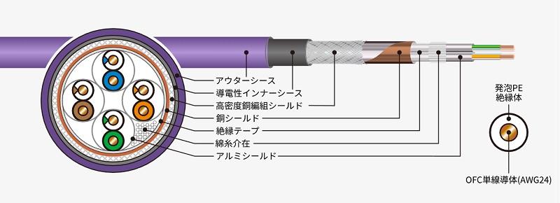 透过铝、铜、高密度铜等不同材质所组合而成的三层屏蔽结构,可在高水准下抑制辐射噪讯与外来串音(Alien Crosstalk),实现有效防止外部噪讯侵入的高机能屏蔽效果。