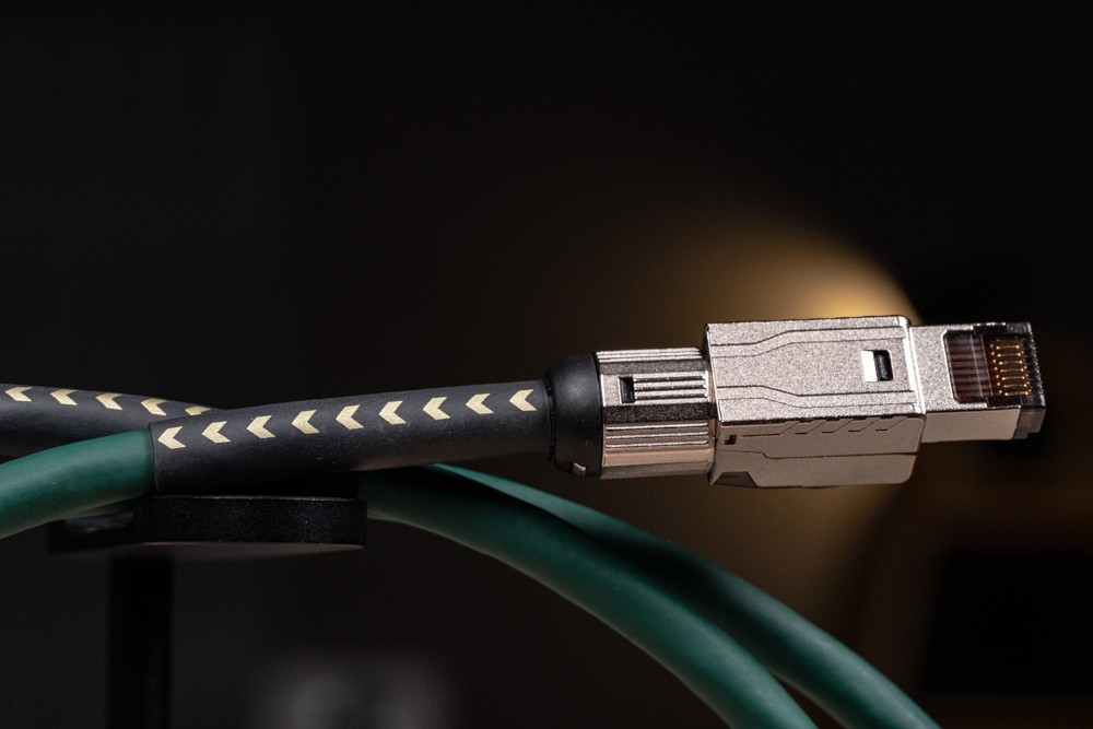 相较于入门级的 NA2,NA4 在外观上最大的差别,莫过于两端的 RJ45 端子。NA2 用的是有金属遮蔽的水晶头,具有一定程度屏蔽噪讯的效果,结合射出成型的塑料尾套,较属于消费型网络线的做法。NA4 就不同了,改采全金属压铸而成的模块化端子,结构类似著名的 Telegartner MFP8,能更有效地抵抗电气干扰,抗噪效果更好。