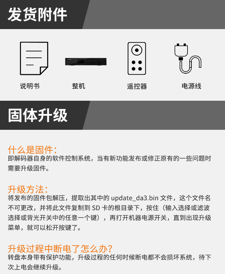 - 可升级固件(当有新功能发布,可通过 SD 卡升级固件来完善系统,或开发全新固件提升系统性能或音质时,由红芯官方统一发布,客户自助升级,升级过程简单快捷。固件下载地址:www.hxmelody.com 固件下载专区)