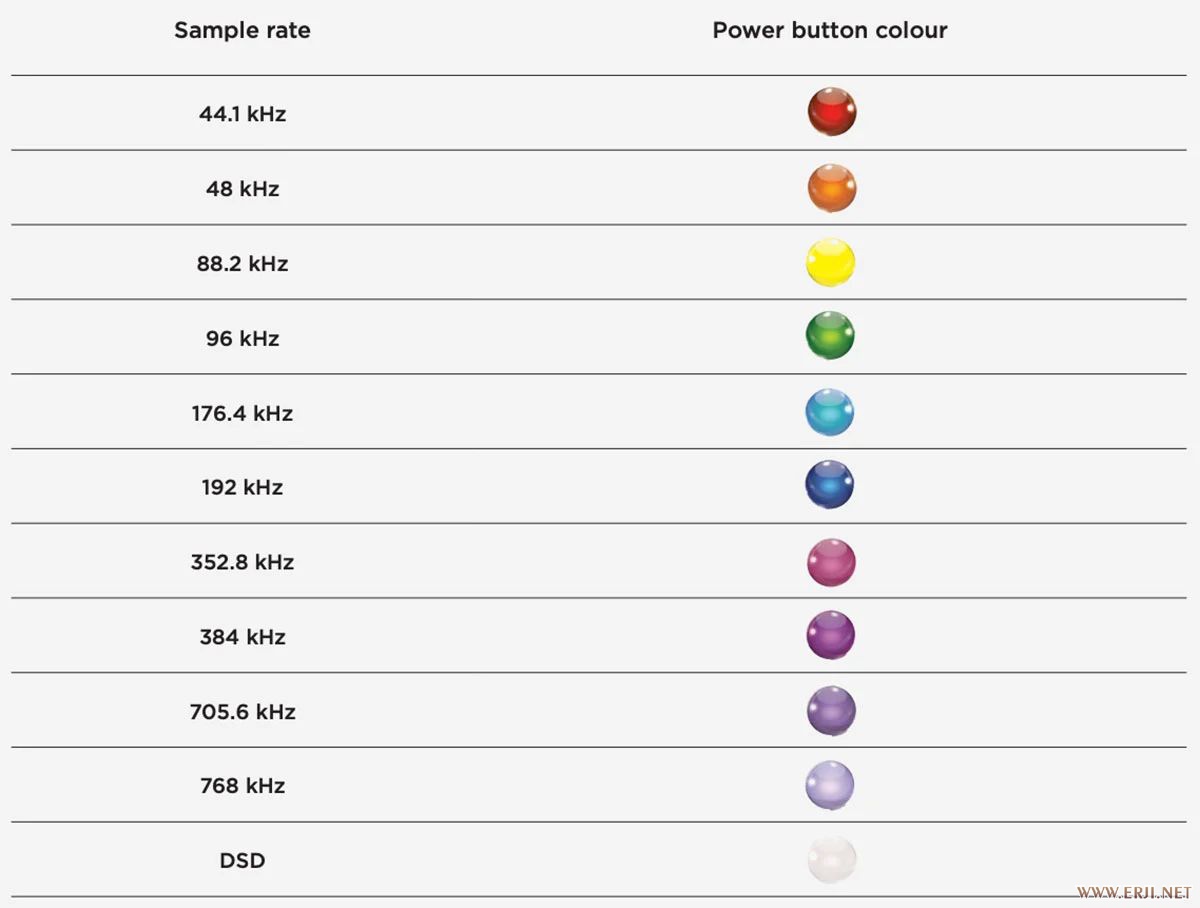 由 44.1kHz 到 768kHz 以至 DSD 等不同的采样率会以开关按钮的不同颜色来显示,这个设计也有不同品牌仿效。