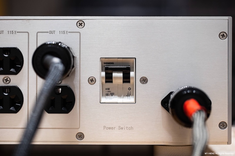 全铝合金的机身,不但机械结构强固,还兼具电磁屏蔽与散热效果。内部配线均使用 5.5 mm平方的 6N 级 OCC 单结晶铜线,且每一条导线都严格遵守方向性原则,是为 MPSource 的正相位原则。内部电源输入后端即为德国西门子制的无熔丝开关,可承受高负载,稳定性和安全性都高。一共 8 组电源插座都是镀铑插座,具有高抗磨、抗腐蚀、抗氧化的特性,耐用性高。它还内建 2 组 12V 的直流电源插座,可供网络设备使用,一次给 2 组,交换器和路由器的需要都解决了。