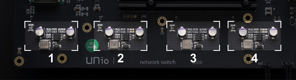 UNio Poki 的 DC 电流输入后,会经过四组独立电源,分别处理 0.95V / 1.1V / 3.3V / 5V 四种不同电压,可以将干扰降到最低。为避免电源干扰,在一排四组独立电源线路上方,加了一块日本进口的 10 fiber 的碳纤维板,作为电磁波屏蔽。这会有效吗?Richard 说,不仅背景更黑,声音密度也更好。