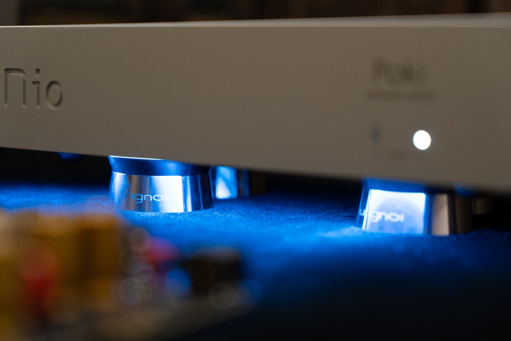 实心不锈钢脚柱高度可根据自身需求选购,甚至加高。音响架可以选择将层板与脚柱全部锁定成一整体,或者把脚柱下方换成尖锥,各层板顶部与脚柱交接处换成垫片,让各层音响架成为独立件,使各层间的彼此影响降到最低。越来越多音响架厂商采取模块化设计,ungnoi 也是其一。