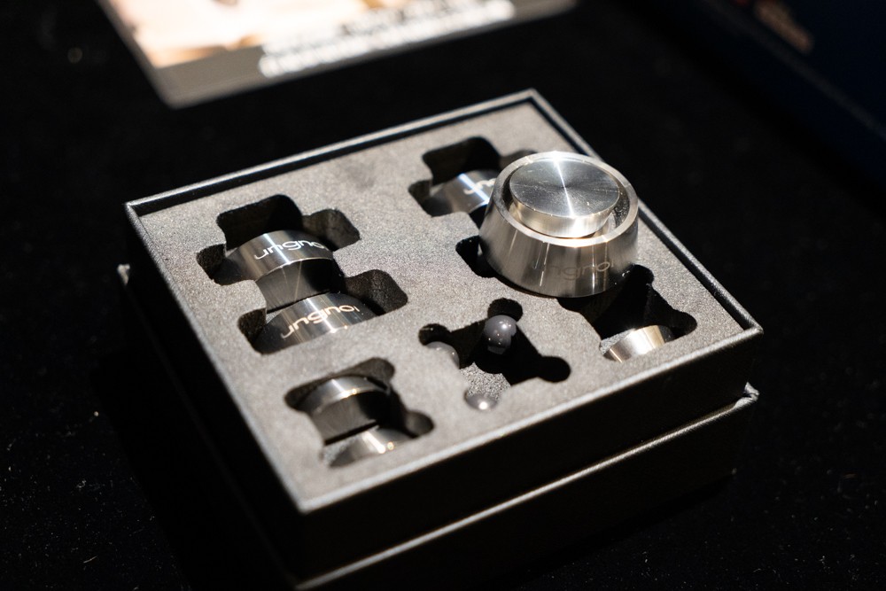 代理商没把太极 Max 带来这次音响展,但带了不自带螺丝孔,只能放置在器材下方的太极 Base,以及体积更小的太极 Nino。前者可以用在包括扩大机在内多数的音响器材上,后者则承重低,仅适合用在前级、讯源、交换器之类较轻的器材设备。
