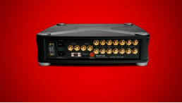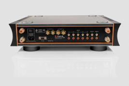 此外,功放侧面和顶部均设有散热元件,这些元件明显带有弗莱明的设计风格。音量按钮的外侧覆盖着钛金属,控制面板则设计成一块大型液晶触摸屏