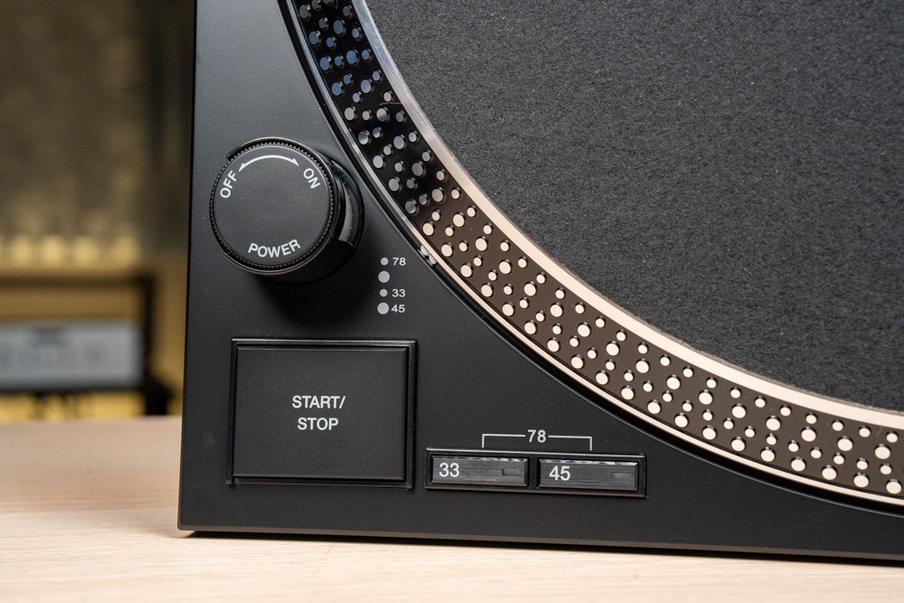 直驱马达采用石英控制转速的 DC 无刷马达,启动时相当有力,很快就能到稳定转速,停止时单击就停。直驱盘和皮带盘不同的地方就在这里。皮带盘是慢慢启动,再慢慢停止,跟直驱盘使用直来直往的感觉不一样。因为是马达直接驱动,透过以电路控制转速,直接按键切换,非常直觉,与皮带盘常见以 pully 更换转速不同。它有三段速度可调,33、45、78 转可自由切换调整。既然是 DJ 盘,一定要有的就是在右侧安排滑轨式 pitch 调整,可在 +/-30% 的范围内调整转速。这种配置,在要求听音乐的家用黑胶唱盘上极少出现,几乎可说是 DJ 盘的专利,让你连播放音乐都可以进行再创作。
