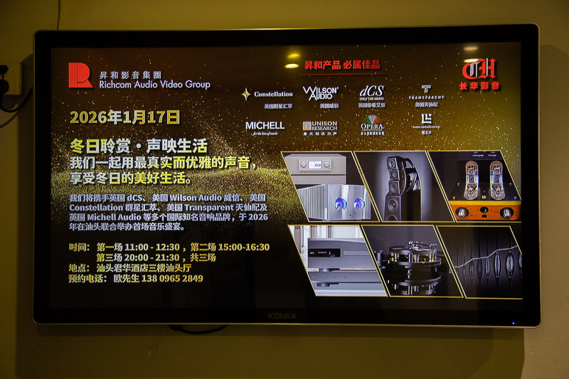 2026年1月17日,由长华影音联合香港昇和影音共同主办的“冬日聆赏·声映生活”高端音响演示会,在汕头海逸君华酒店三楼汕头厅成功举行。活动携手英国 dCS、美国 Wilson Audio(威信)、美国 Constellation Audio(群星汇萃)、美国 Transparent(天仙配)以及英国 Michell Audio 等多个国际一线音响品牌,为本地乐迷及发烧友呈现了一场集技术解析与音乐欣赏于一体的冬日音乐盛宴。