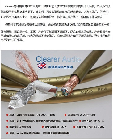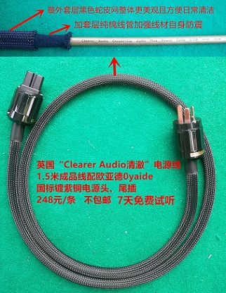 性价比电源线——英国“Clearer Audio清澈”电源线,1.5米成品线配欧亚德0yaide国标镀紫铜电源头、尾插,248元/条,不包邮,可7天免费试听(收到货时起7天内),听感不满意退回即退线款,来回运费自付哦!散剪120元/米(散剪不支持7天免费试听)!咨询微信或电话:17724567098 李生。