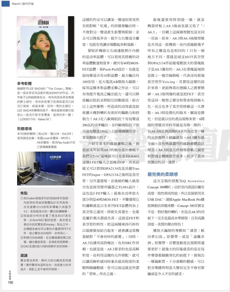 这次定稿的搭配为Q Acoustics Concept 300喇叭;由于其内部设计拥有高度一致性与高性能,所以直接使用其USB DAC,连接Apple MacBook Pro播放无损音讯档来听。Concept 300其实并不是一对好推的喇叭,但是在A8.3的伺候下,完全是最高水平展现、且有高识别度、美质的声音特色!