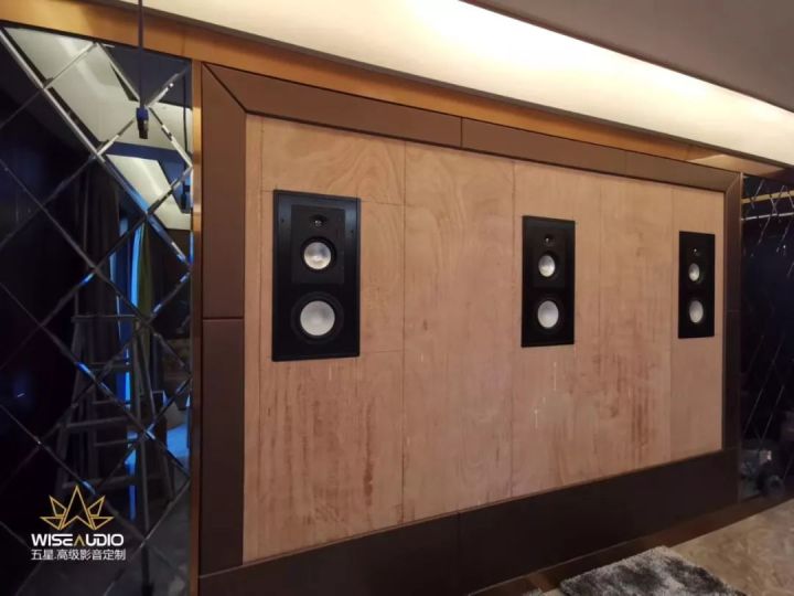 业主家是一个精装房,安装家庭影院对房间的美感是非常具有挑战性的,设计师选用了德国CANTON InWall 989 LCR 的三只扬声器作为主声道,并将主声道扬声器在幕布后面隐藏安装。选用的三只特性完全相同的音箱作为主声道扬声器,能够的轻易的获得清晰的人声和准确的声场定位,为家庭影院音响音效打下了良好的基础。