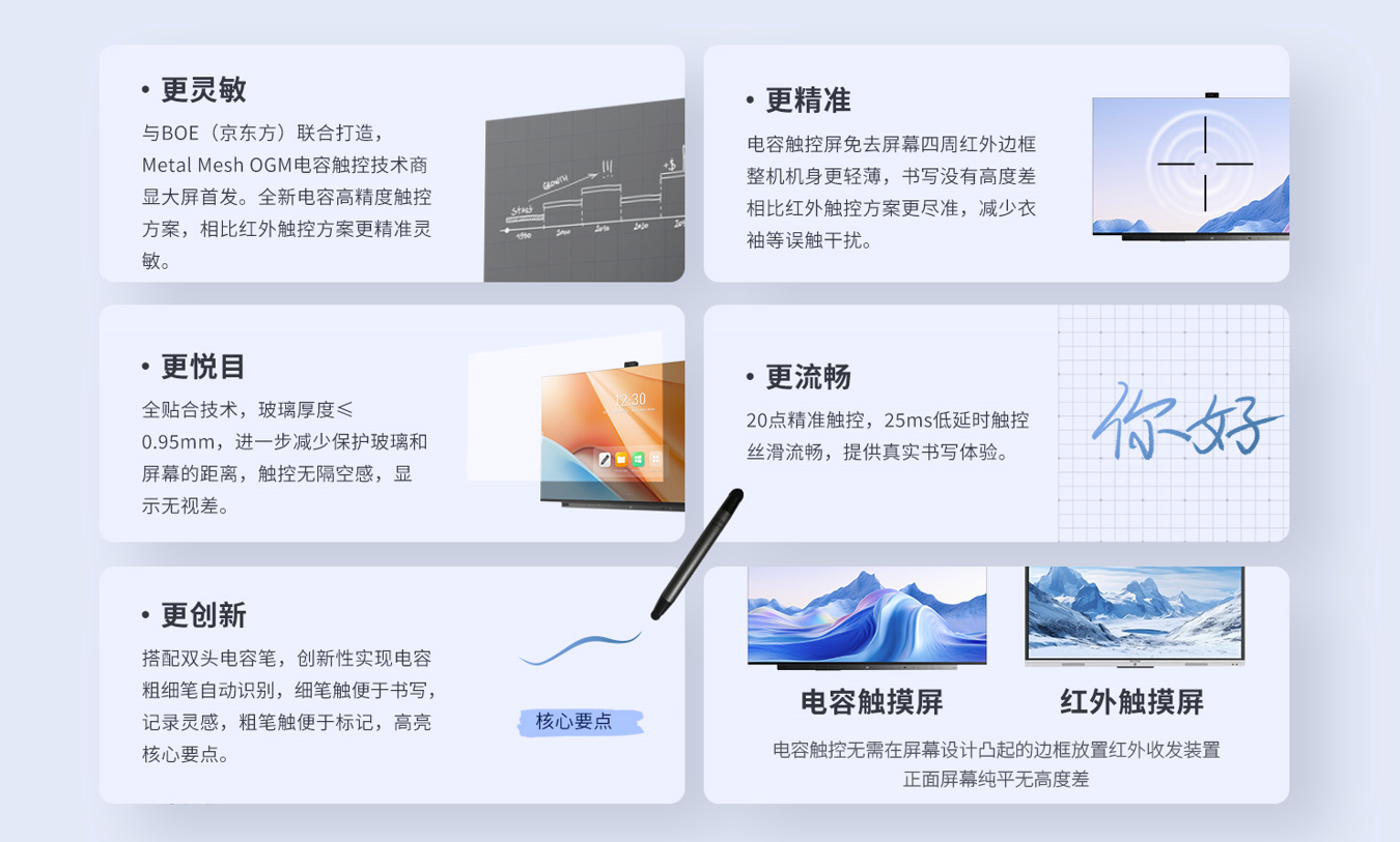 联想thinkplus会议平板P65+采用OGM技术的电容会议平板,引领着电容触控屏幕技术的新时代。屏幕采用BOE(京东方)Metal Mesh OGM电容触控技术,所选用的高精度触控方案,相比传统红外方案,不仅可提供更准确的触控,更从技术层面杜绝会议平板书写时衣角袖口导致的误触。屏幕不仅支持多达20点触控便于多人协作,更将书写延时降至25ms以下,相比红外类产品提速近30%,使会议随心书写,笔记流畅无阻。