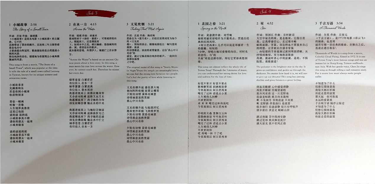 1. 经典选曲,多元风格融合:《又见邓丽君》系列专辑自 2016 年开始策划,历经多年打磨,每一张都承载着独特的意义。黑胶唱片中的选曲涵盖了邓丽君不同时期、多种语言的经典且热门的歌曲。既有如《甜蜜蜜》《月亮代表我的心》《何日君再来》等脍炙人口的国语金曲,又有粤语的《星》和日语的《北国之春》等不同语言版本的佳作。这些歌曲风格多样,轻松俏皮的民歌小调、舒缓缠绵的日本演歌、深情款款的情歌等,在陈佳的演绎下,重新焕发出迷人的光彩。